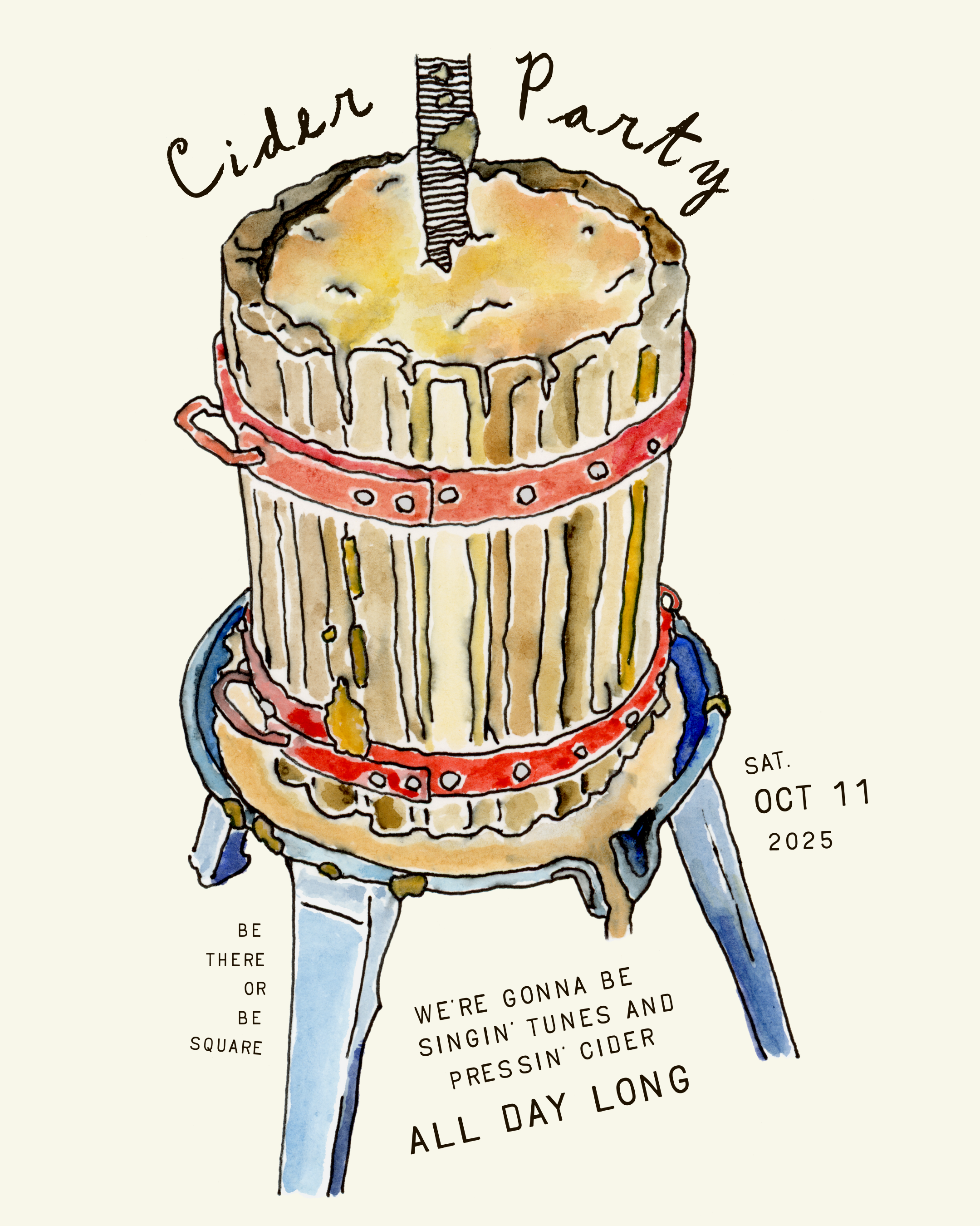 Our house— address & parking info can be found here.We’ll start pressing cider at noon and go ‘til we run out. Some friends of ours are planning a live music set in the evening (exact time TBD, probably around 5), so you’ll want to stick around for that. Feel free to come by earlier in the day, leave for a bit and come back, or stay all day if you please. Up to you.